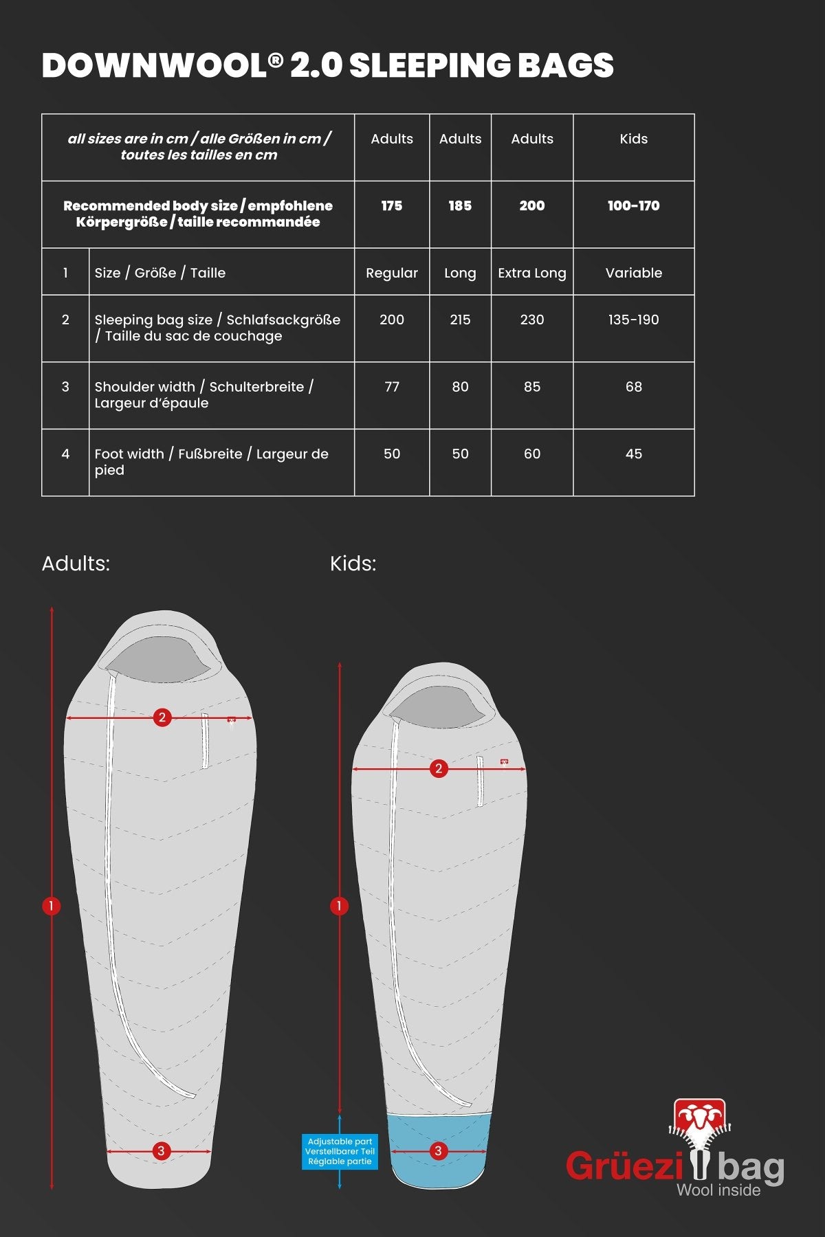 Leichter Sommerschlafsack DownWool Extreme light regular Größentabelle